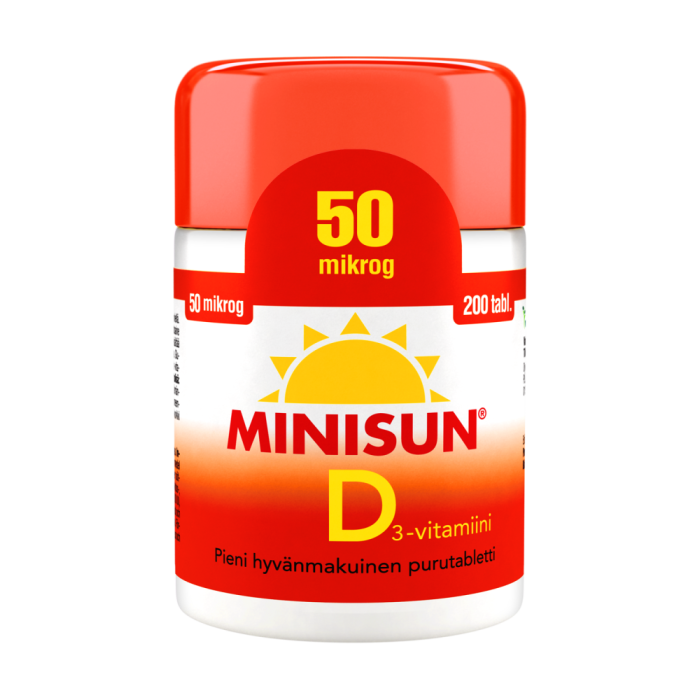 Minisun-tabletit sisältävät hyvin imeytyvää D3-vitamiinia. Hyvänmakuiset Minisun-tabletit voit imeskellä, pureskella, niellä tai murskata.