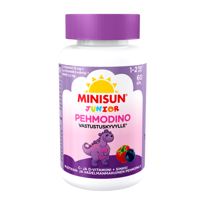 Minisun Pehmodino Super Defence Dosering: 1-2 st dagligen. Barn 3-10 år 1 st per dygn och barn över 10 år 2 st per dygn. Innehåll: Dygnsdosen (1-2 st) innehåller D3-vitamin 5-10 µg 100-200 %* C-vitamin 75-150 mg 93,5-187%*, Zink 2,5-5 mg 25-50%* *Av referensvärdet för det dagliga intaget Förteckning över ingredienser: Sötningsmedel (maltitol), vatten, gelatin (av nöt), C-vitamin, honung, naturliga aromer (blåbär, hallon), zink, koncentrat av svart morotjuice, D3-vitamin (kolekalciferol), ytbehandlingsmedel (karnaubavax). Innehåller sötningsmedel. Överdrivet bruk kan ha laxerande verkan. Gluten-, laktos-, mjölk- och sojafri. Bör observeras: Ersätter inte en balanserad och mångsidig kost eller en hälsosam livsstil. Doseringen får ej överskridas. Förvaras oåtkomligt för barn. Förvaras i rumstemperatur skyddad från ljus och fukt.