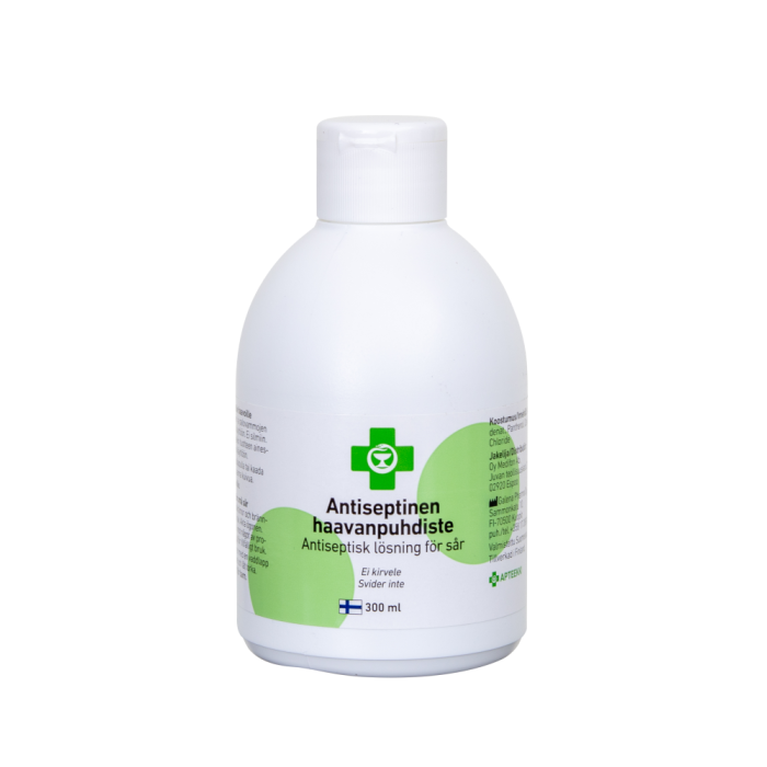 Antiseptisk lösning som inte svider, för rengöring av små sår, skråmor och brännskador. Innehåller pantenol som vårdar huden. Tillverkad i Finland. Användningsändamål: Antiseptisk lösning som inte svider, för rengöring av små sår, skråmor och brännskador. Dosering: Häll lösning på en vaddlapp och putsa huden med den eller häll direkt på hudområdet som ska rengöras och låt torka Förteckning över ingredienser: Aqua, Alcohol denat., Panthenol, Cetylpyridium Chloride. Bör observeras: Innehåller pantenol som vårdar huden. Förvaras utom räckhåll för små barn. Storlek: 300 ml Övriga uppgifter: CE-märkt medicinteknisk produkt. Tillverkad i Finland. Tillverkare: Galena Pharma Oy, Finland Distributör: Oy Medifon Ab, Esbo